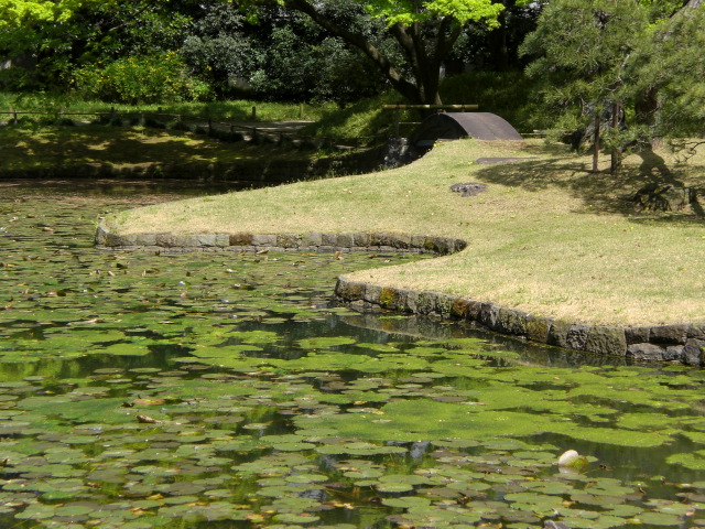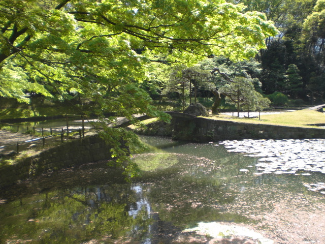 内庭には、日本式の庭園の典型として、池と築山、池に架かる石橋と周囲を巡る小路がそろっています。