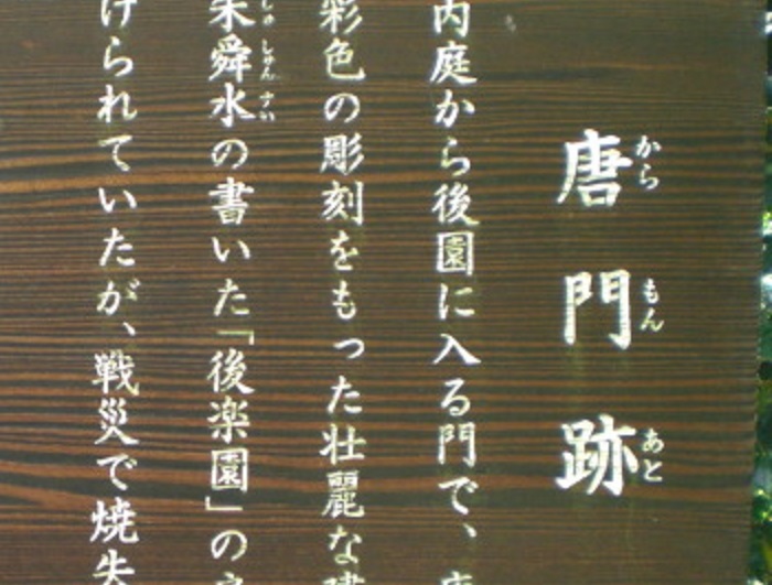 唐門跡の解説文には、「内庭から後園に入る門で、唐様の極彩色の彫刻をもった華麗な建築物で、朱舜水の書いた後楽園の扁額が架けられていたが、戦災で焼失した。」と記載されています。