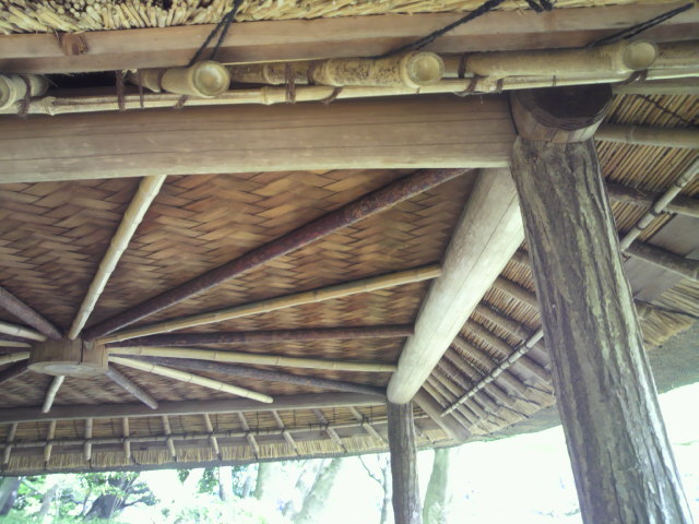 茅葺屋根の小さな四阿で、中央に小さな赤い毛氈の座席が置かれています。