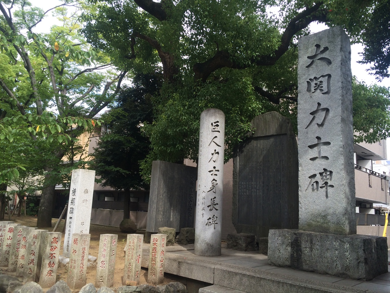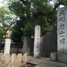 富岡八幡宮の正面の大きな鳥居をくぐり参道を歩くと右側にあります。大きな石碑で目立ちますが、正面の社殿が立派で目に入るので見逃してしますかも知れません。石碑の後ろには大きな木があり石碑を見ていると心が和みますが参道の人通りが多いので賑やかな場所です。