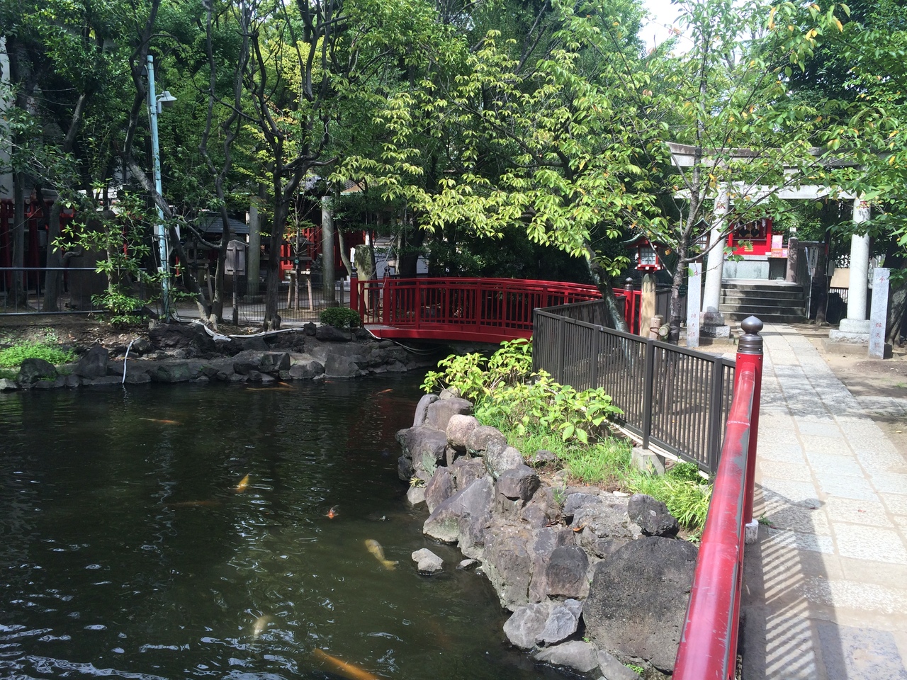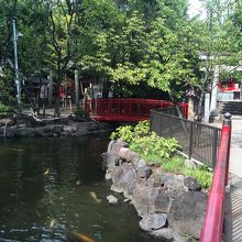 富岡八幡宮の端にあるので見逃してしまうかもしれません。池には鯉がたくさん泳いでいて池にかかっている橋の色が赤く目立って良い景色を醸し出しています。社は小さな社ですが鳥居もあり雰囲気が良いです。参道や社殿のエリアは人が多いですが、この場所は人が少なく落ち着ける場所でした。