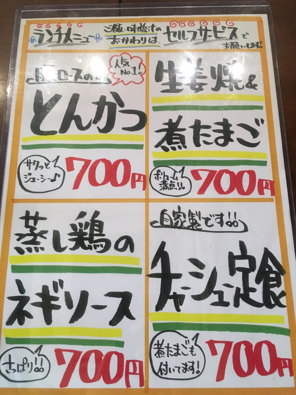 1階の表に出ている生姜焼&唐揚げの写真を見て、食べたいと思ってお店に入りましたが、店内のメニューを見たら、生姜焼&煮たまごとなっていました。少しがっかりしました。