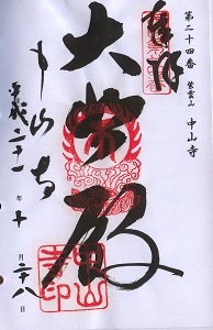 中山連山登山の帰りに、西国三十三ケ所霊場の御朱印を頂く目的で中山寺に行ってきました。子授かり、安産のお寺として有名です。大きな山門を潜ると境内は広く、鐘楼、閻魔堂、涅槃堂、配置されている本堂、護摩堂、開山堂、大師堂(中には33ケ所のお砂踏みがある。)、大願塔、阿弥陀堂等が配置されています。これら諸堂を見るだけでも価値があります。夕方近くに行ったせいか人も少なく、静かだったので厳かな雰囲気を感じました。