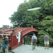 木造の橋で、周りの緑と対照的な、朱色が色鮮やかです。