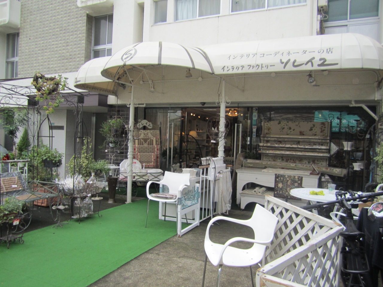インテリア ファクトリー ソレイユは、東急自由が丘駅正面口から北西の方向へ少し歩いたところにあるインテリアのお店です。通り沿いのお店の前に椅子やグリーンが飾られていて雰囲気の素敵なお店です。家のお庭がこんな雰囲気だったら・・・と憧れます。