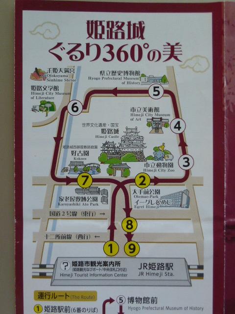 今日は姫路を散策しています。駅前の観光案内所で「城周辺観光ループバス」を教えてもらって早速利用します。バス料金は一回乗車で100円、一日乗り放題は300円でこちらは周辺施設の割引付きです。お得ですね。周遊は姫路城の周囲をぐるーと左回りに回るコースで途中7ヶ所の停留所があります。バスへの乗車は運転席横の前方からのみの乗車なので、降りる人が降りて乗車することとなりますので注意してくださいね、料金は後払いです。しかしバスが万一事故などで緊急脱出は後方からでれません。いいのかなぁ~。バスはレトロなデザインで一緒に写真するのも良いと思います。ご利用くださいね。
