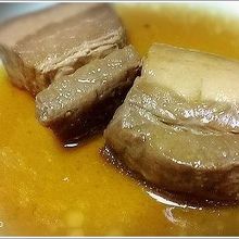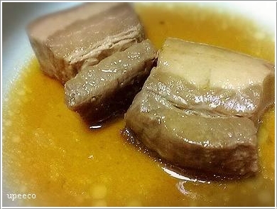 皮つきの豚バラ肉を赤ワイン入りのたれでじっくりと煮込んだもの。