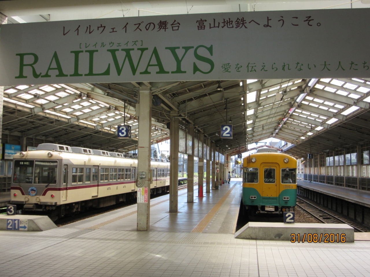 三浦友和主演の映画RAILWAYSの舞台。最初はのどかな田園風景、後に川から山岳の素晴らしい景観にかわり、立山に着く。2年前に同じ鉄道の富山~宇奈月温泉にも乗ったが(1時間30分程度と記憶)、どちらも1時間以上の長距離なのに車両にトイレが付いていないのは大いに困った。列車の本数がさほど多くないので、トイレは高齢者や観光客には必要だと思った。夏休みも終わりに近い8月末の平日の朝であったので、