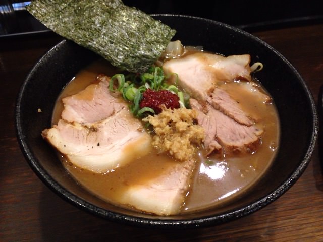 厚めのチャーシューとネギ、辛味噌、のり、生姜おろしが入って、かなり美味い!濃厚なスープだが、最後まで飽きるなく飲み干せます。