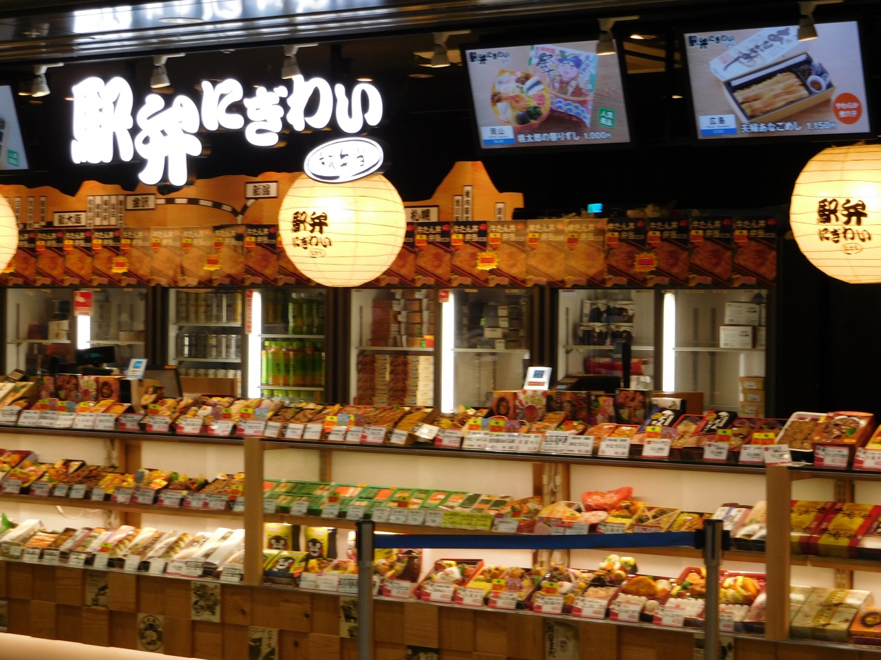 JR新大阪駅構内の「エキマルシェ新大阪」の手前側にあるお店です。駅弁を探していたら、店頭のショーケースにずらっと全国の駅弁を並べたお店があり、びっくりしました。いろいろと目移りしてしまい、選ぶのに時間がかかってしまいますが、どんな駅弁があるのか見るだけでも楽しめるお店です。また、駅弁の実演販売のコーナーもありました。
