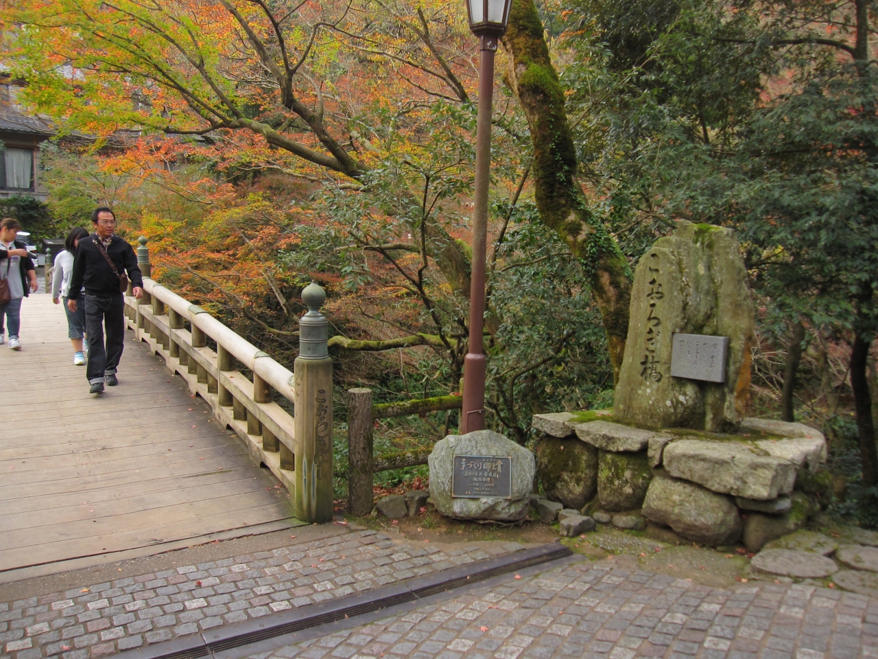 山中温泉のメインストリート(ゆげ街道)を昇っていくと道が2本に分かれ箇所がある。「こおろぎ橋」の案内板を確認しつつ、左側の坂道を少し歩くと「こおろぎ橋」が出てくる。小さな橋である。車一台がやっと通過できるほどの幅であり、長さも10メートル前後の木製の橋である。しかし、欄干越しに鶴仙峡を見るといかにも山の中にいる事を痛感し、気持が穏やかになる。時間がなく鶴仙峡遊歩道コースに行けない方は橋の側に鶴仙峡に降りる場所があるので利用して欲しい。11月に行った時に欄干に書かれている橋の名前がひらがなと漢字で書かれている事を初めて知った(写真を参考にして下さい)。
