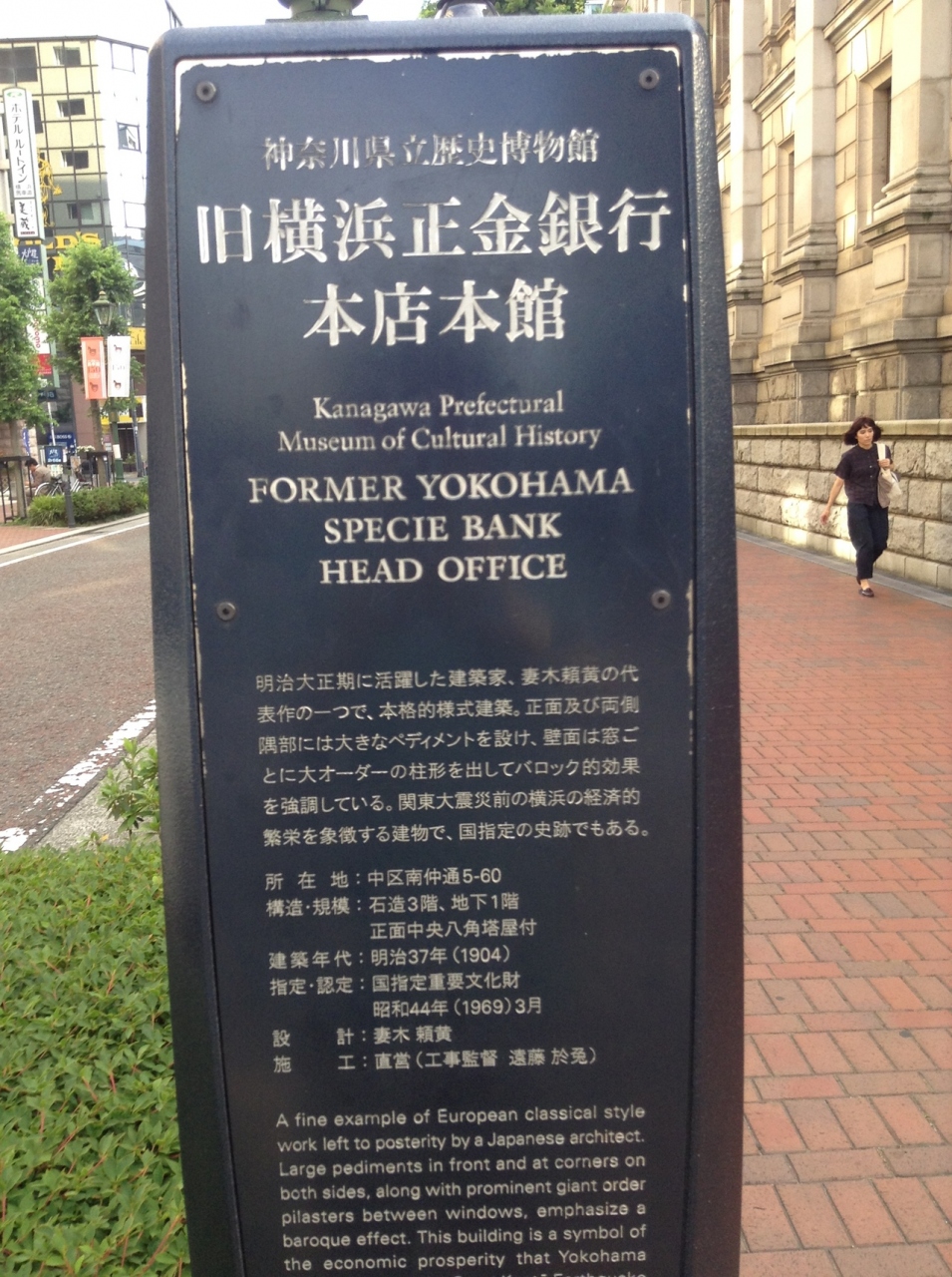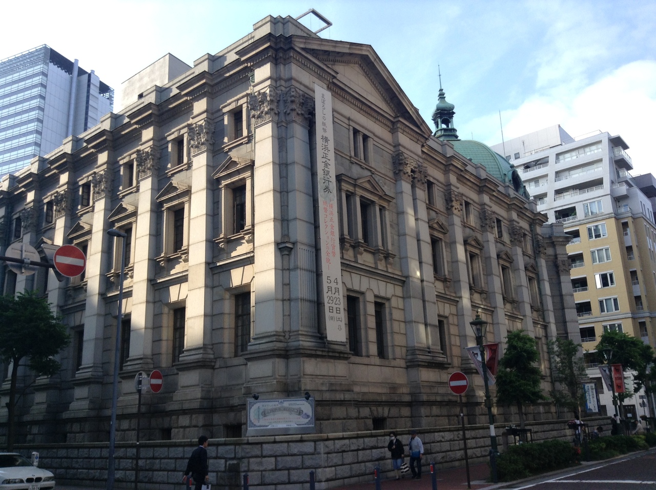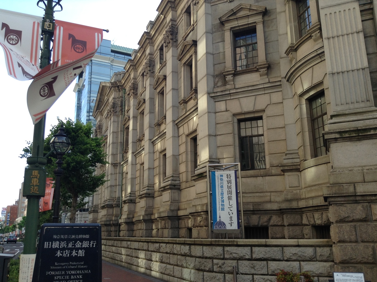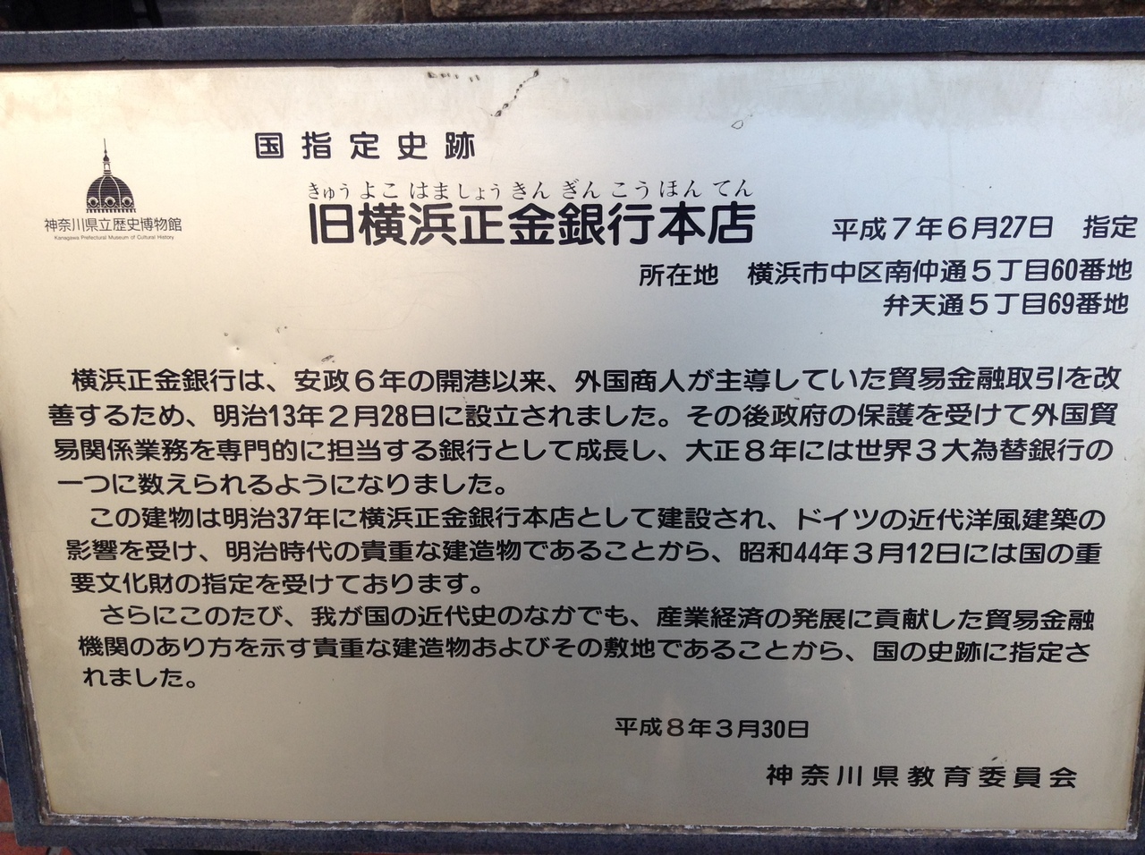 40代以上には東京銀行の前身として記憶される正金銀行。ここ横浜に本店跡が県立博物館として残っています。明治37年に落成し、大正12年の関東大震災で焼失しましたが、戦後に復元され、現在は文化財指定を受けています。石像の明治の近代建築で、エースのドームと最近愛称がつけられたようです。