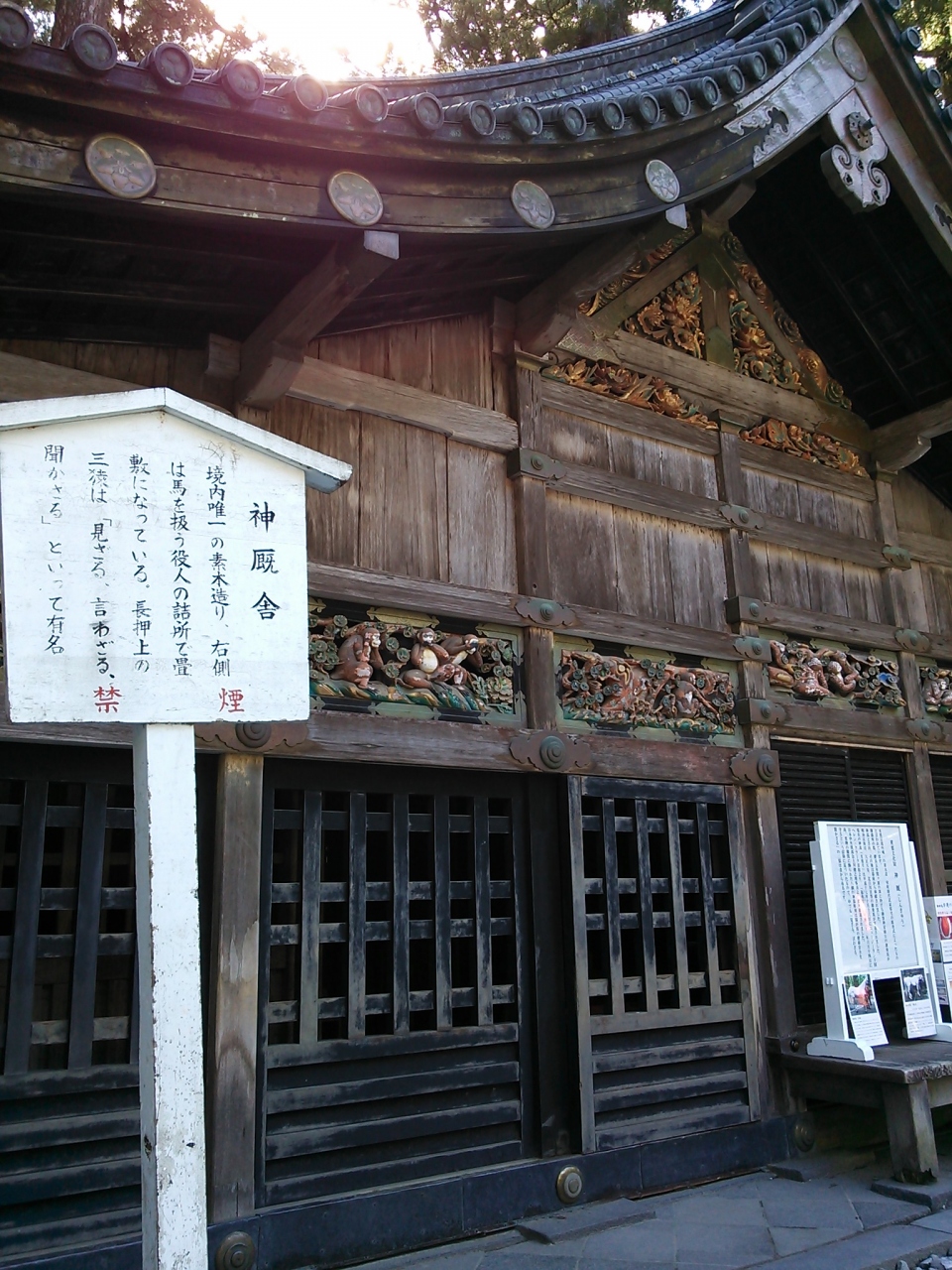 有名な「三猿」の彫刻が施されている建物で、ご神馬をつなぐ厩(うまや)です。昔から猿が馬を守るとされているところから猿が彫られているようですね。