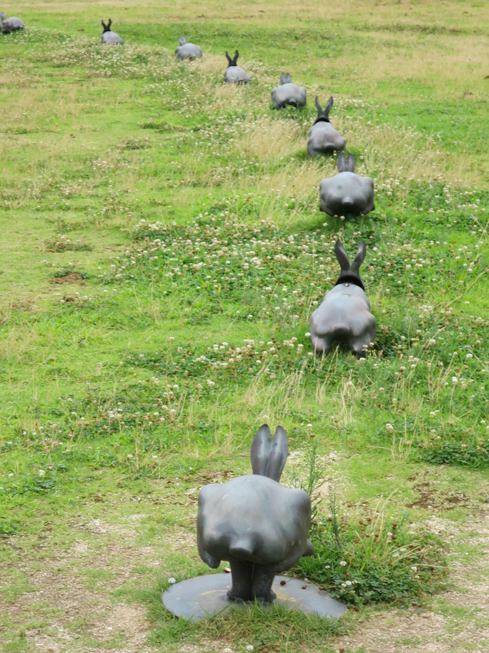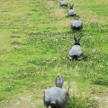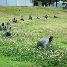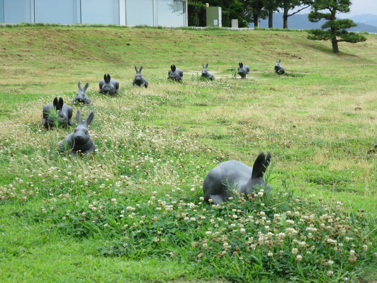 美術館は扇型をして、宍道湖を一望できるようになっており、夕焼け時にはさぞかしきれいだろうと実感。目的の宍道湖うさぎはその前に広がる芝生の上に、12匹の可愛らしいうさぎが居ます。願掛けする湖から2羽目のうさぎは多くの人に触られ1匹だけ、磨かれていました。