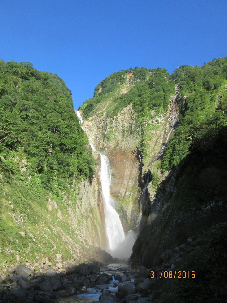 明らかに称名滝より落差はあり約500メートルはあったが、水量は称名滝の勢いにははるかに及ばなかった。聞くと常時みられる滝ではなく雪解け時等に見られるとのことで、たぶん大雨の一日後だったので現れたと思う。三角形でクロスして落ちる滝を見れてとてもラッキーだった。