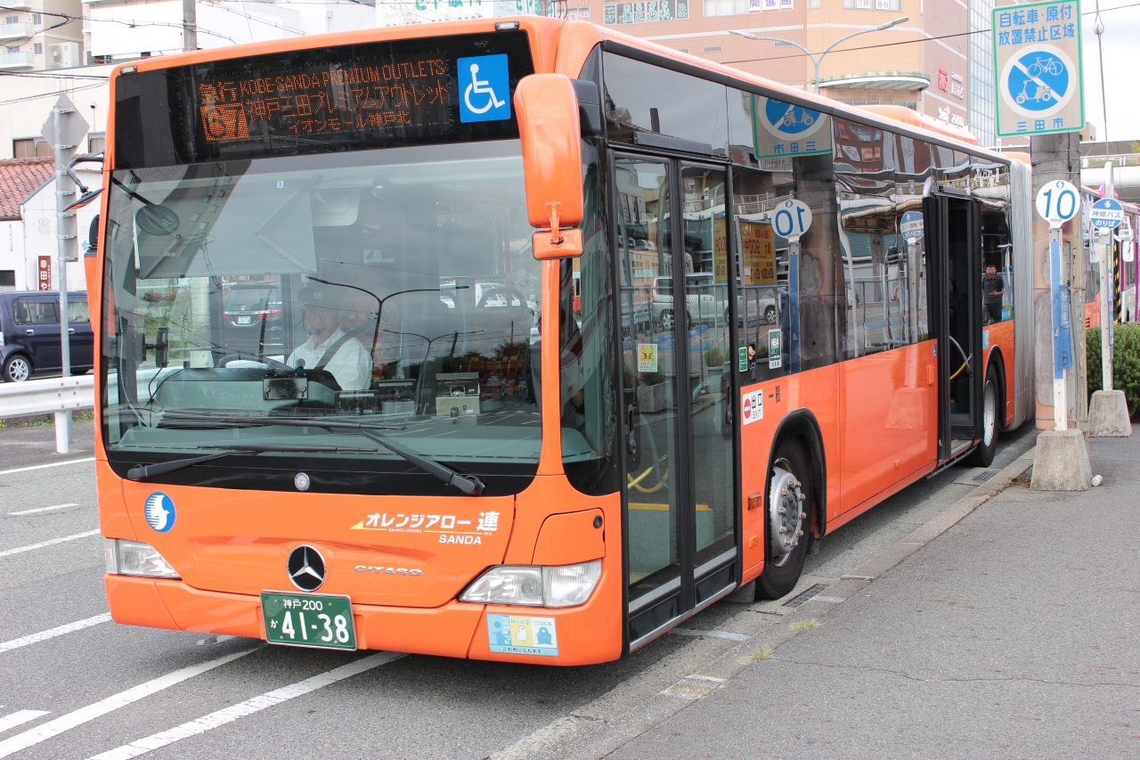 JR三田駅にて、関西で初めて運行を開始した連節バスと対面(2016年に近江鉄道が導入したため唯一ではありません)。オレンジ色の車体が目を引きます。「オレンジアロー連SANDA」という愛称が付けられています。平日は新三田駅、土日祝日は三田駅で見ることができます。充実している路線にICカードも使えるのがありがたいです。