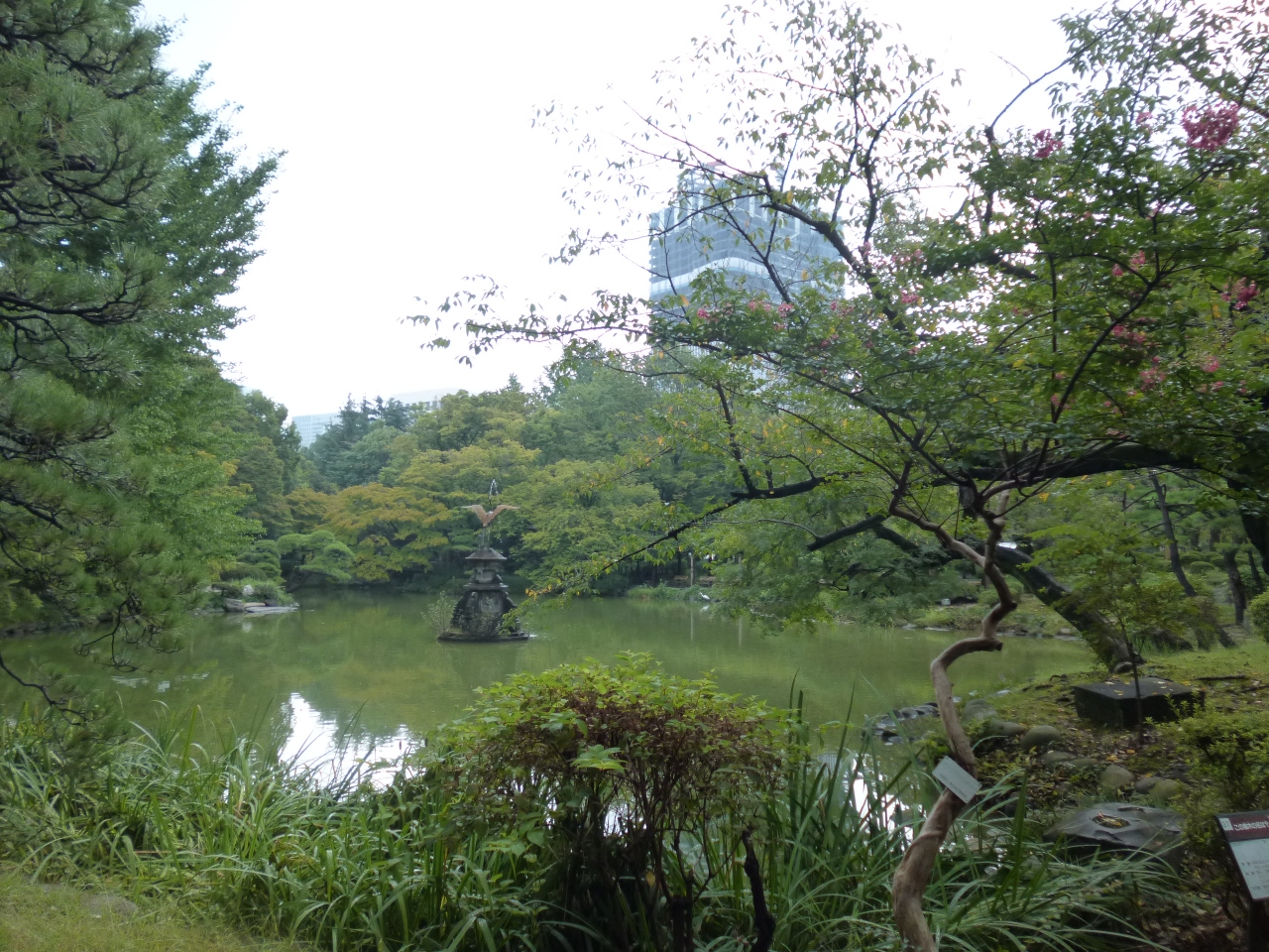 周囲を木々で囲まれた神秘的な池の中央に、鶴の形をした噴水があります。木々の緑と池の緑が濃く、素晴らしい景観だと感じました。紅葉の時期にも是非訪れてみたいと思います。