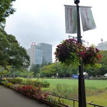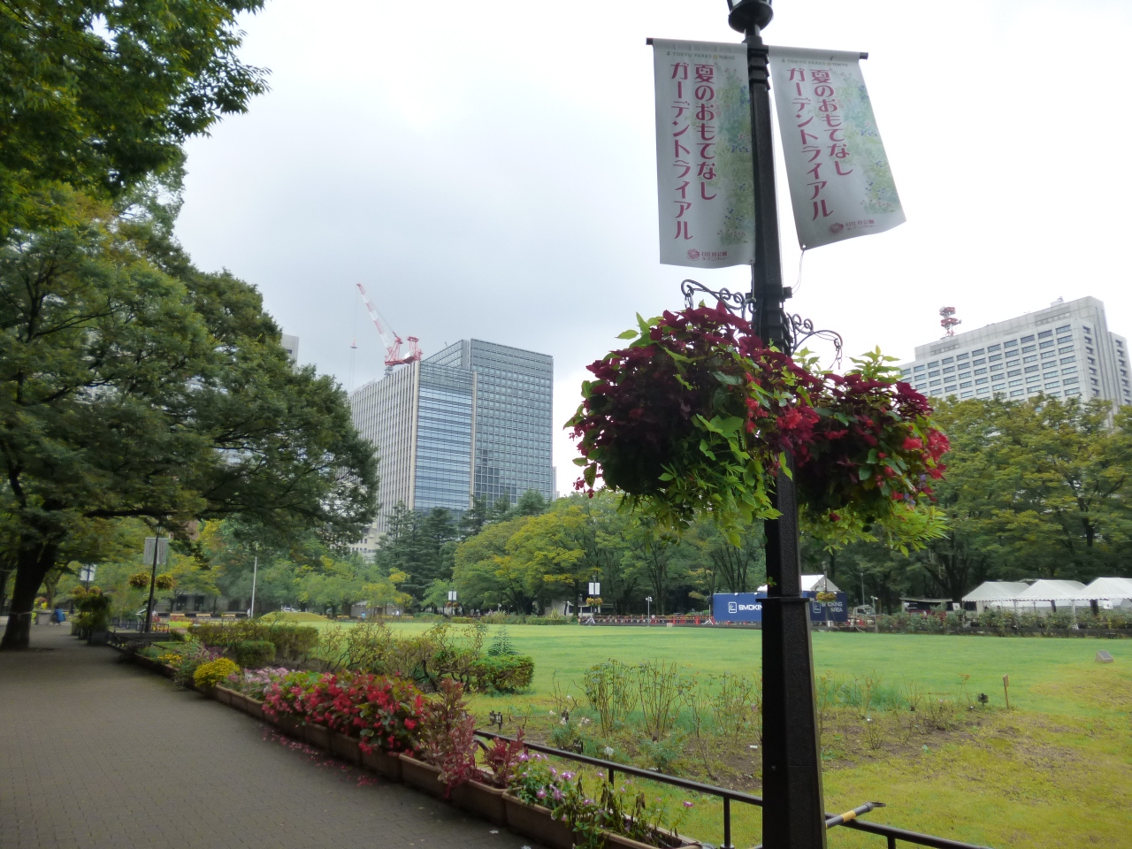 日比谷公園を散策しましたが、9月の平日の、雨交じりの日という事もあり人の姿は少なかったです。「第二花壇」には一部に花が咲いているものの、全体としては殺風景な光景でした。花壇の向うに見える日比谷公会堂やプレスセンタービルが目立っていました。