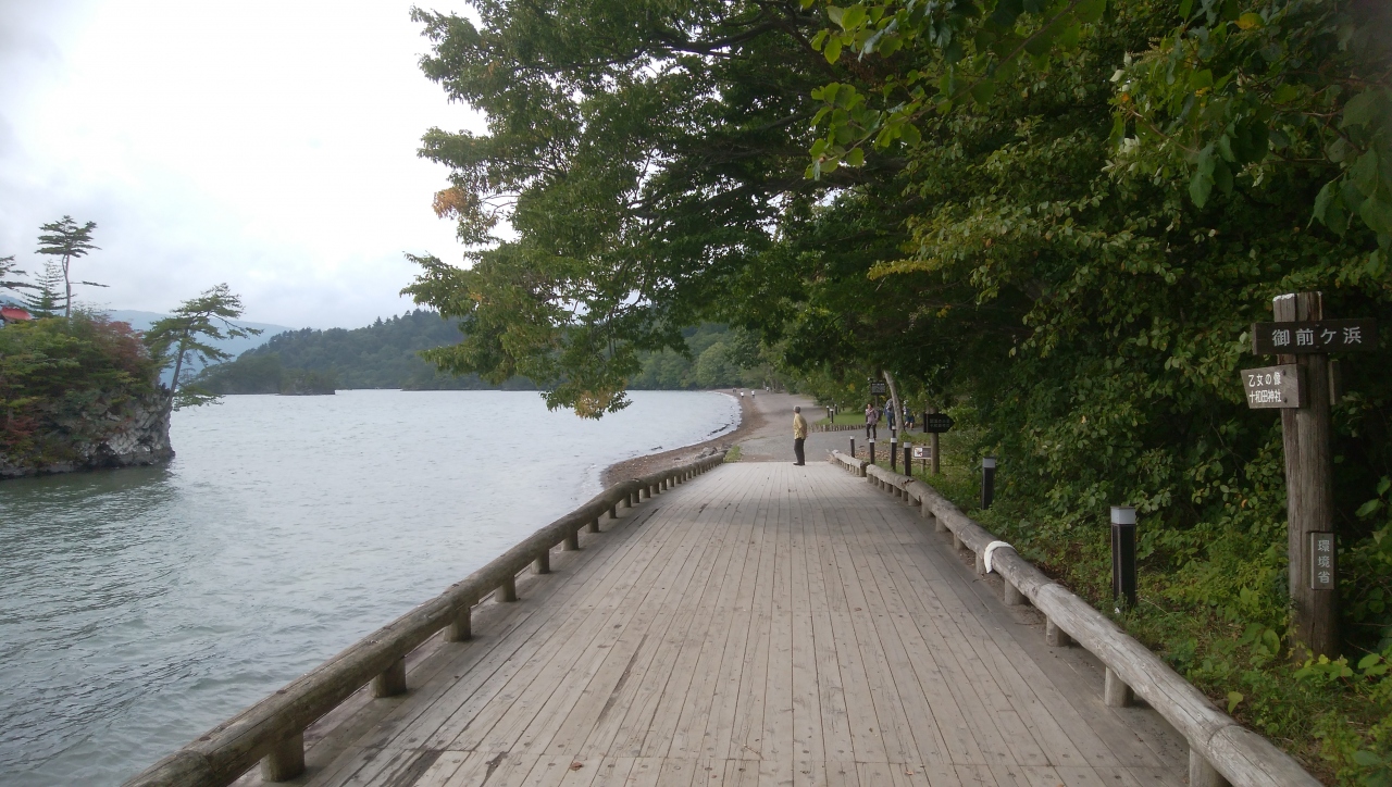 十和田湖の休屋地区の桟橋から乙女の像に向かっていく、ルートで基本的に湖畔を行くルートです。十和田湖の風景を眺めながら行く道のりなので、何となくまったりとした感じを味わうことが出来ます。途中にはお土産屋さんがあったり、デッキがあったりと陸側は変化に富んでいます。時期によっては観光客が多くて忙しない時期もあるんでしょうが、自分が訪問したは9月の3連休の時期でしたが意外なほど落ち着いていました。のんびり散策できる道だと思います。