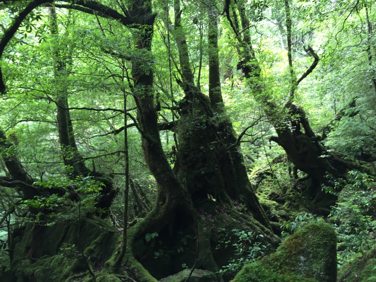 うっそうと茂る木々も、巨岩も倒木も、見渡す限り緑色の苔に覆いつくされています。