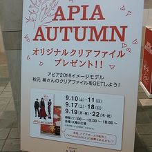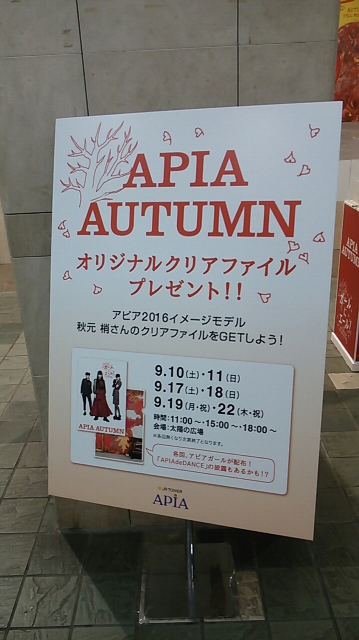 2016年9月19日の敬老の日の夕方に立ち寄ったところ、2016年9月22日、太陽の広場というところでアピア2016イメージモデルの秋元 梢さんのクリアファイルが貰える旨掲示がありました。