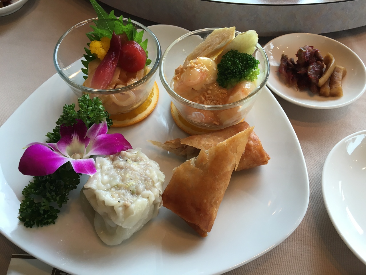 出汁のしっかりしたコーンスープに、甘めに味付けされたエビマヨ、エビがプリプリでした。揚げたての春巻きはしっかりめの味付け。