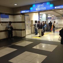 JR横浜駅直結のバスターミナル。スカイビルにあります。駅から案内に従って進むと着きます。コンビニもあり、乗車前の買い出しもできます。待合は一箇所で、時間近くになると呼び出しがかかり 二列に並びます。その後、バス前に移動する段取りでした。