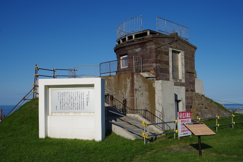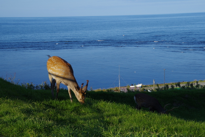 宗谷岬と道路を挟んだ反対側の階段を上ると、宗谷海峡を一望できる小高い丘に出ます。ここにあるのが旧海軍望楼です。国境を警備するために明治時代に建てられたもので、以前は石造りのらせん状の階段で屋上へ出ることができたようですが、今は立ち入り禁止になっているようです。その傍ではエゾジカがのんびりと草をついばんでいました。