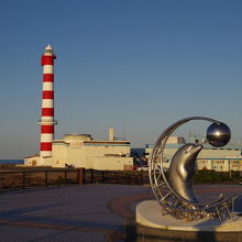 ノッシャプ岬の突端には、白地に赤横帯が見た目にも色鮮やかな灯台が目を惹きます。日本で2番目に高い灯台だそうで、ノシャップ岬の碑、イルカのモニュメントが設置されている(恵山泊漁港)公園から振り返ると、大きな灯台がイルカのモニュメントに重なり、鮮やかに夕陽を浴びていました。
