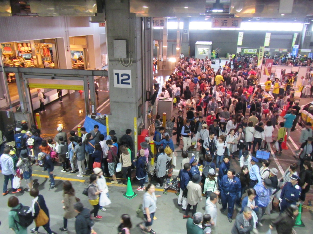 生マグロの解体ショー&即売、¥300円野菜詰め放題のほか、青果品部門と魚介類部門の市がたち、一般のお祭りのようにたくさんの椅子、テーブルが並ぶ中、露店がたちます。
