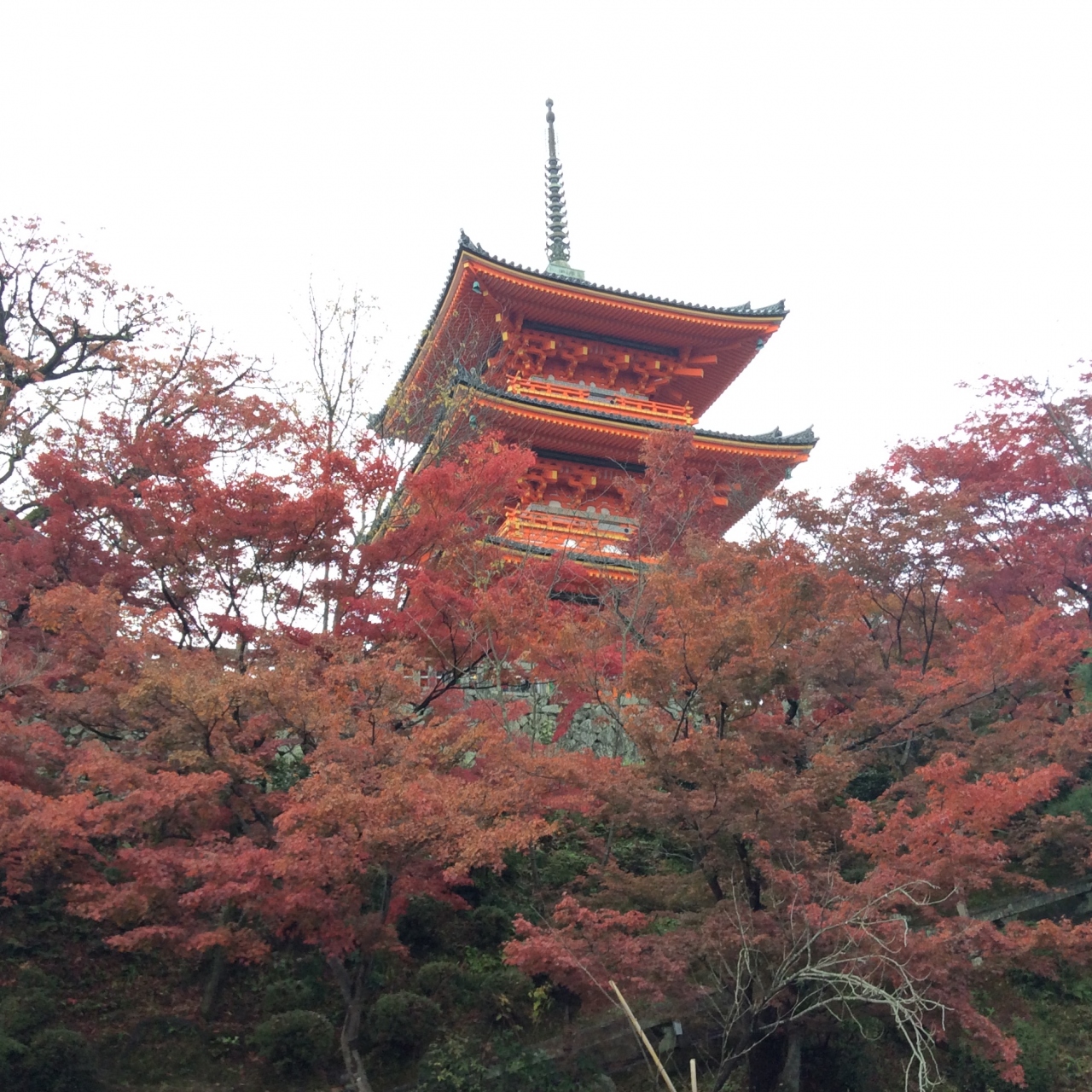 名だたる清水寺の三重塔。清水寺は山の斜面に建っていますから、境内を散策した最後、下から見上げるとかなりの迫力です。