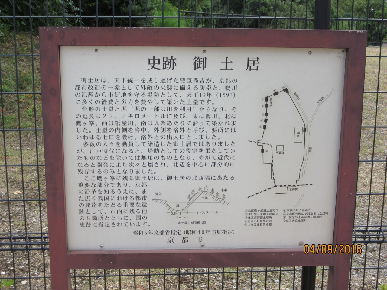 天下統一を果たした豊臣秀吉が京都を外敵から守る防塁と鴨川の氾濫から市街地を守る堤防として1591年に築いた土塁の跡。土塁と堀からなり、総延長は22.5キロ。