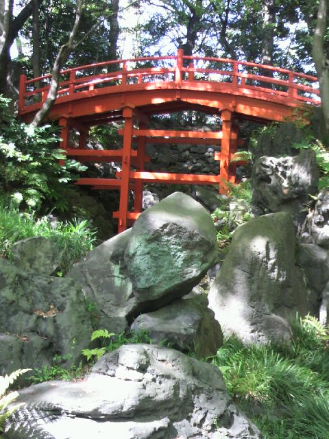 京都・東山東福寺の通天橋を手本として、小石川後楽園の西側を流れる大堰川の渓流に、朱塗りの反り橋形式の虹橋を架ける設計としています。