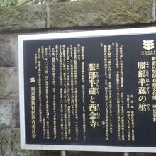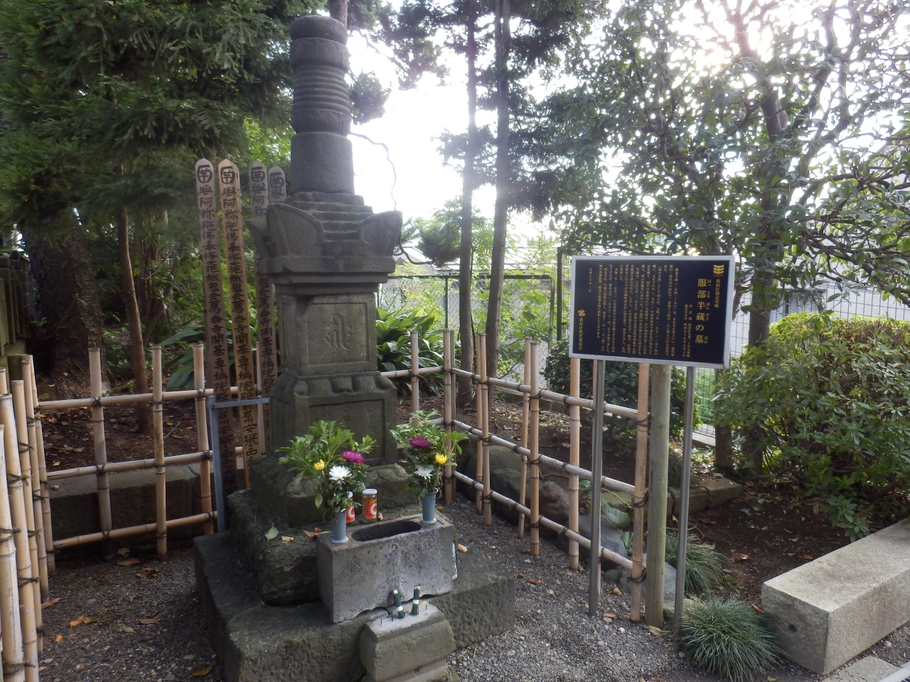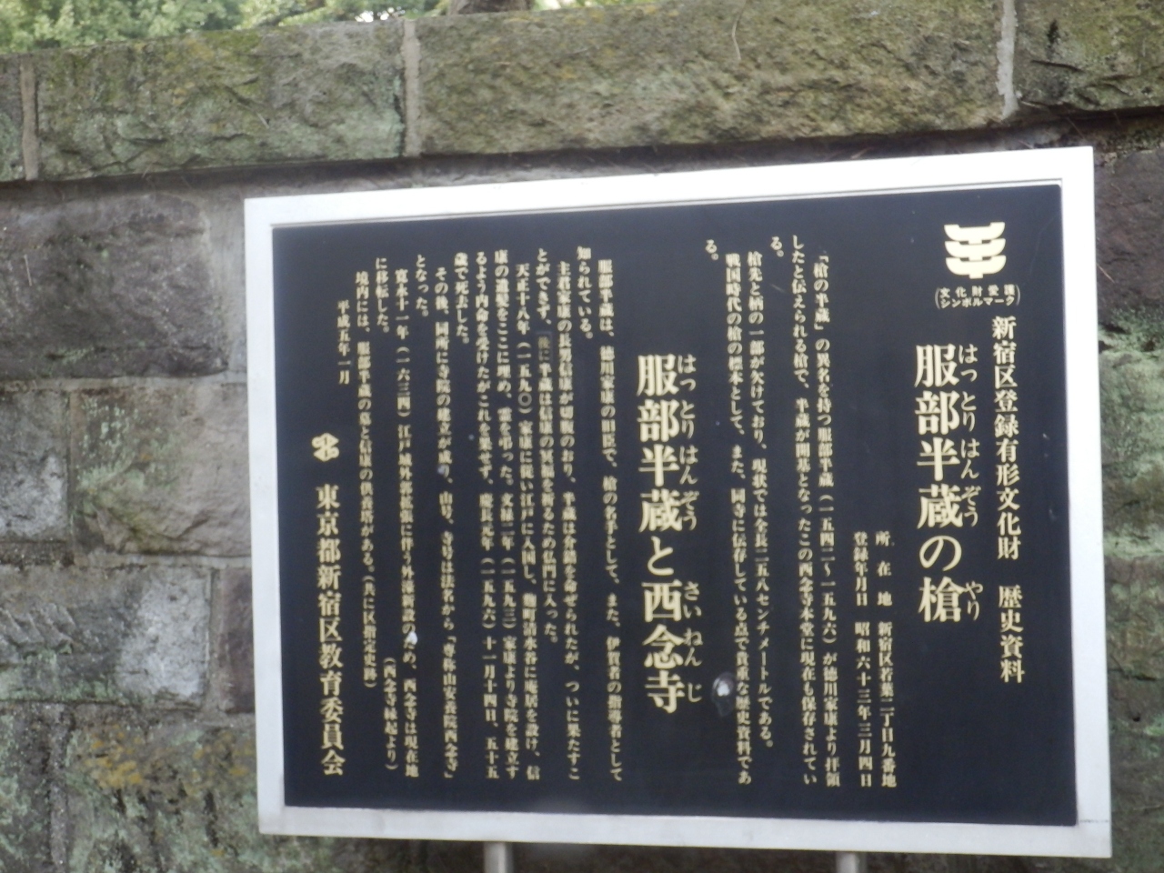 徳川家康に仕えた服部半蔵のお墓は四谷駅からほど近い場所にある西念寺の境内にあります。門を入るとすぐに見える本堂を右に通り過ぎ、裏手にある墓地への入口部分にお墓はありました。墓石の傍らに案内看板が出ているので分かりましたが、お墓は見過ごしてしまうほど小さかったです。