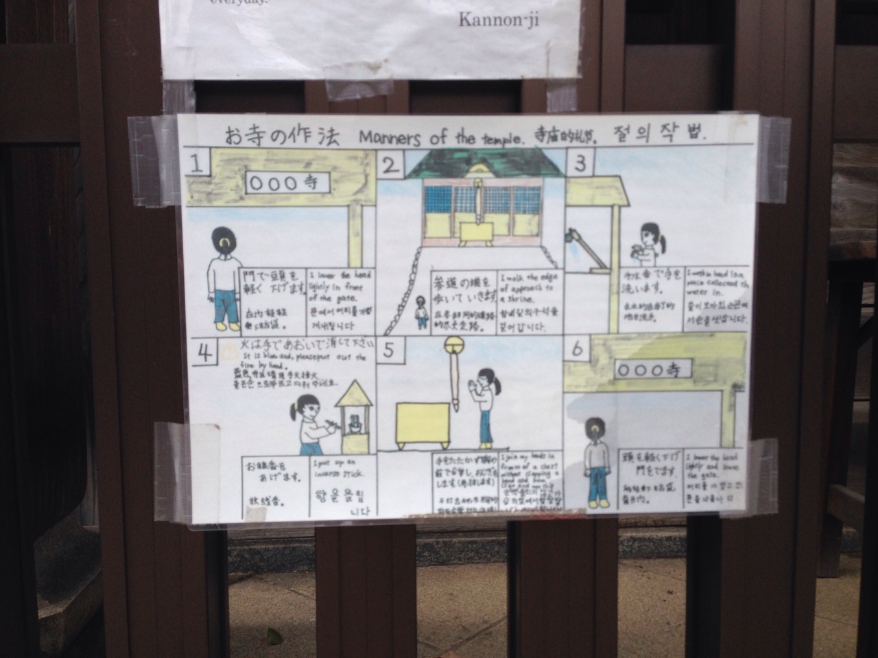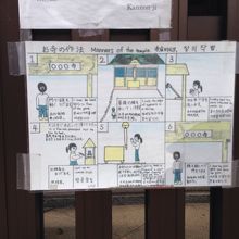 この壁が有名なため外国人観光客も多いのでしょうか…お寺にはお参りの仕方なるものの英語での説明がありました。