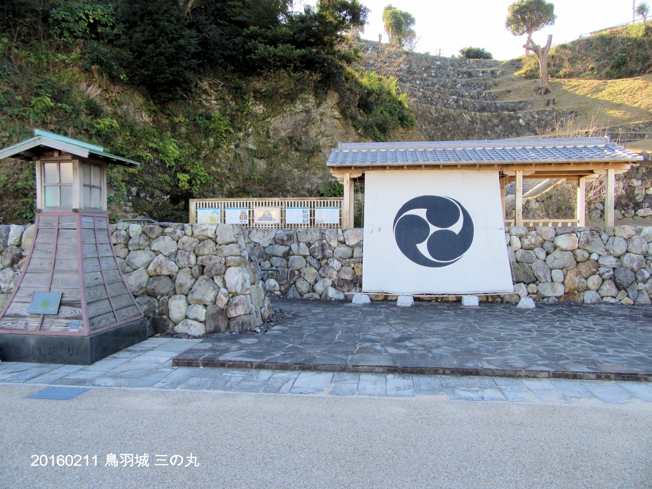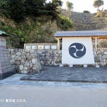 鳥羽城跡を鳥羽湾側から入ると、三の丸広場があります。入口には鳥羽城の説明板とパンフレットが置いてあり、鳥羽城の概要を知ることができます。階段状に幾重にも連なった石垣がきれいに再建整備されていますが、当時の遺構かどうか判然としないところもあり、ちょっと首をかしげながらの見学となりました。車で来られた方は、三の丸広場前に数台分の駐車場があり便利です。