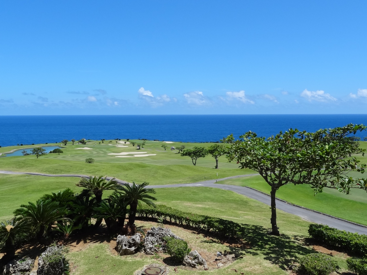 生き生きとした緑のホールに、青い海と空が魅力で、