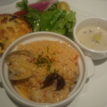 きのこのキッシュと魚介リゾット+コーヒーで1250円(税込)を注文。キッシュは美味しかったですが、魚介リゾットはお米がねちっとしすぎていました。