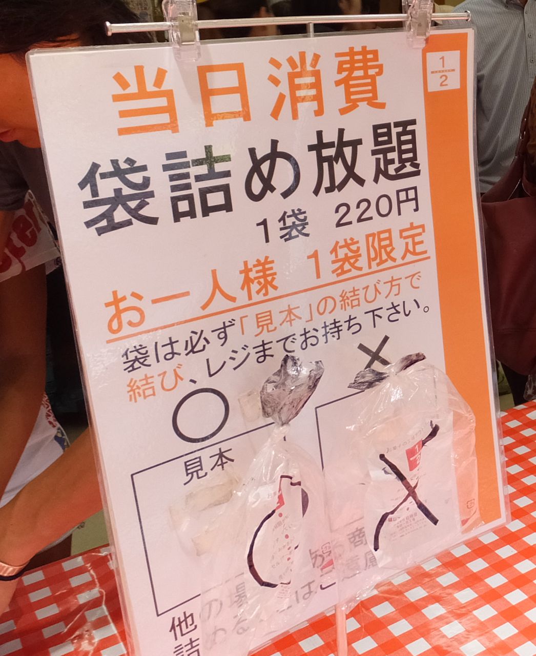 賞味期限が当日限りとなった桔梗信玄餅を220円で詰め放題というもので、普通は2個で330円ですが、だいたい16~20個くらい詰められます。