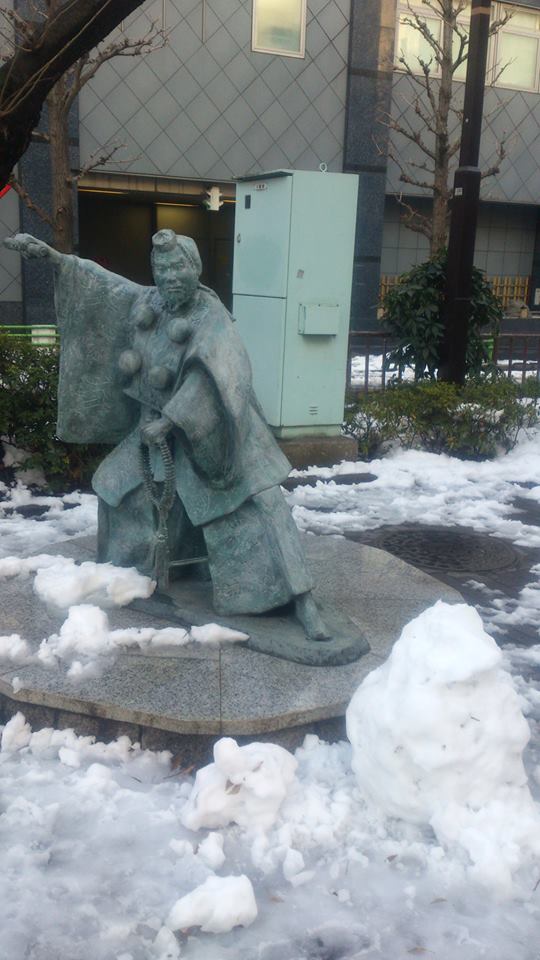 東京都内に大雪の降った2014年2月9日の朝、人形町界隈、街角のあちこちに雪だるまが出現していました。長さ400メートルほどの浜町緑道にも10体ばかり。甘酒横丁との角に立つ勧進帳の弁慶像の前にも富樫なんでしょう、不格好な雪像ができていたのですが…弁慶の気魄に感ずるところがあったか、いつの間にやら溶けてしまってました。