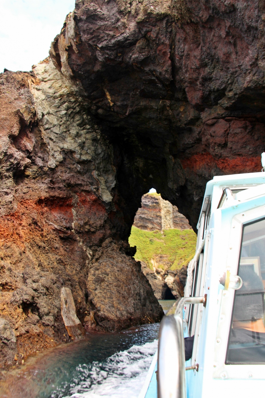 【滝見の岩屋】は、西ノ島でのクルーズ観光船【国賀めぐり定期観光船】で見ることのできる西ノ島の北崖にある石アーチで、アーチの下を観光船が通りその景観を楽しみます。