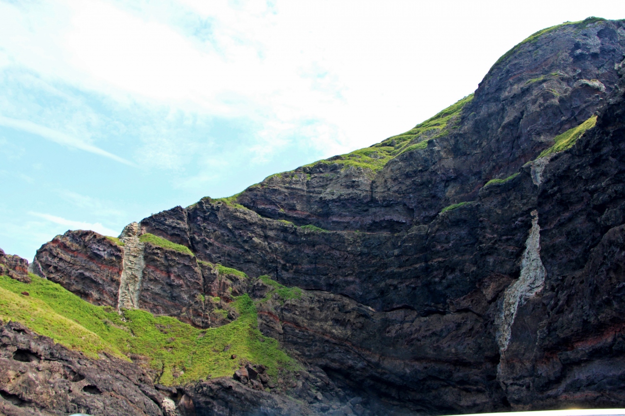 しかし、滝見の岩屋のアーチを抜けて、滝の水がほとばしる崖へと船が近づくと、先ほどまで見えていた白い水の流れは消えてしまい、代わりに目の前に現れるのは赤と黒の地層の中を縦に横切る白い岩石層。