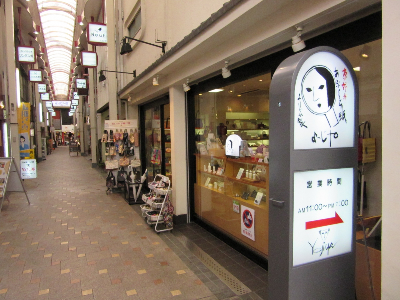 油取紙で有名なよーじやの商品は海外でも人気が高い。私はいつも京都に行ったらこの本店で購入している。その理由は人通りが少なくてスタッフも他の店と比べて親切だからだ。京都駅のよーじやは品数が少なく、またよーじやカフェを備えた3条店や哲学の道店はいつも多数の客で混雑していてスタッフもあまり感じがよくない。本店は新京極を入った花遊小路の中にあり目立たない。また本店限定のビニールカバーに入ったセットも販売している。