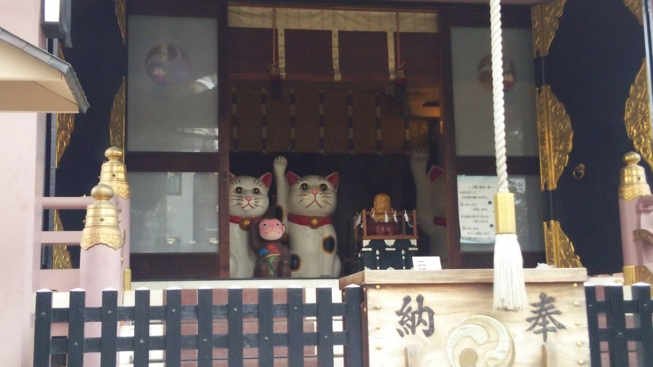 待乳山聖天から徒歩5分。浅草名所七福神の福禄寿をまつった今戸神社に着きます。境内には若い女性が目立ちました。人力車に載ってきた方もいました。招き猫の発祥の地ということで猫の置物がたくさんありました。御朱印もいただくことができました。