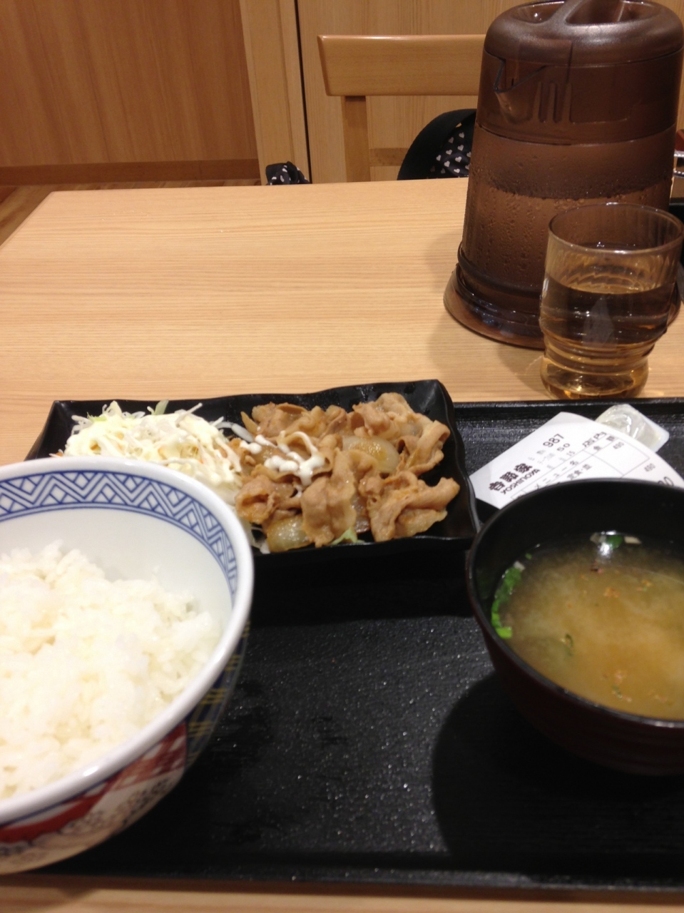 成田空港第二ターミナルの二階にある、吉野家さん、飛行機出発まで時間があるので腹ごなしのために入りました。11時前と言う事もあり、結構空いていました。生姜焼き定食が490円。空港でもTポイントがためれるところもよいです。