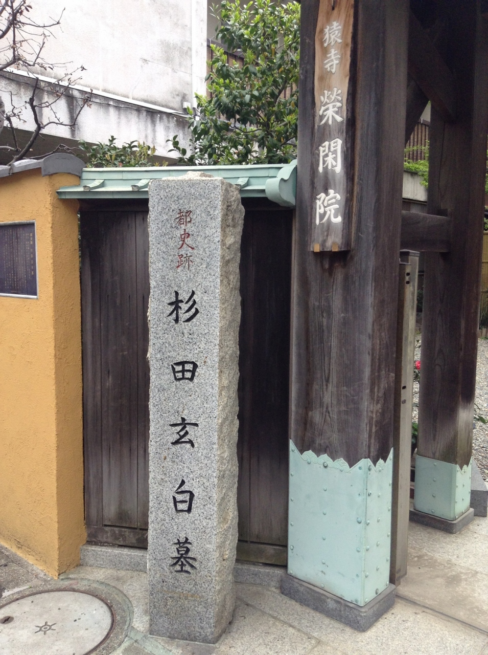 神谷町駅から徒歩2~3分の所にある浄土宗の滎閑院にあります。杉田玄白は、ターヘルアナトミアを訳した解体新書で有名ですが、共同作業者の前野良沢との確執などこの辺りの経緯を知って面白かったので、思わぬ所で杉田玄白に会えました。歴史上の有名人ではありますが、お墓は案外小振りなものでした。