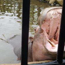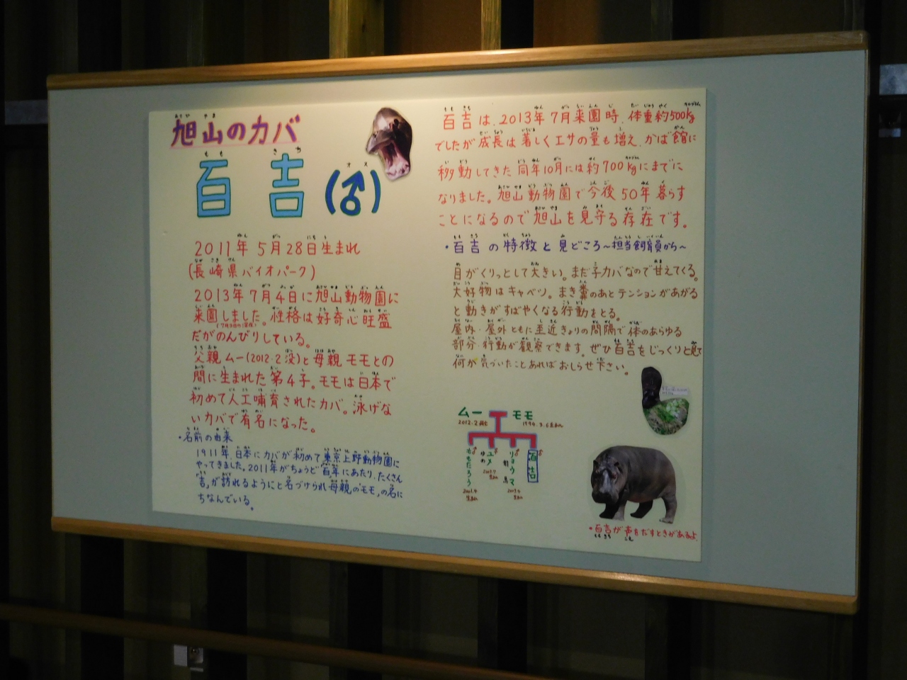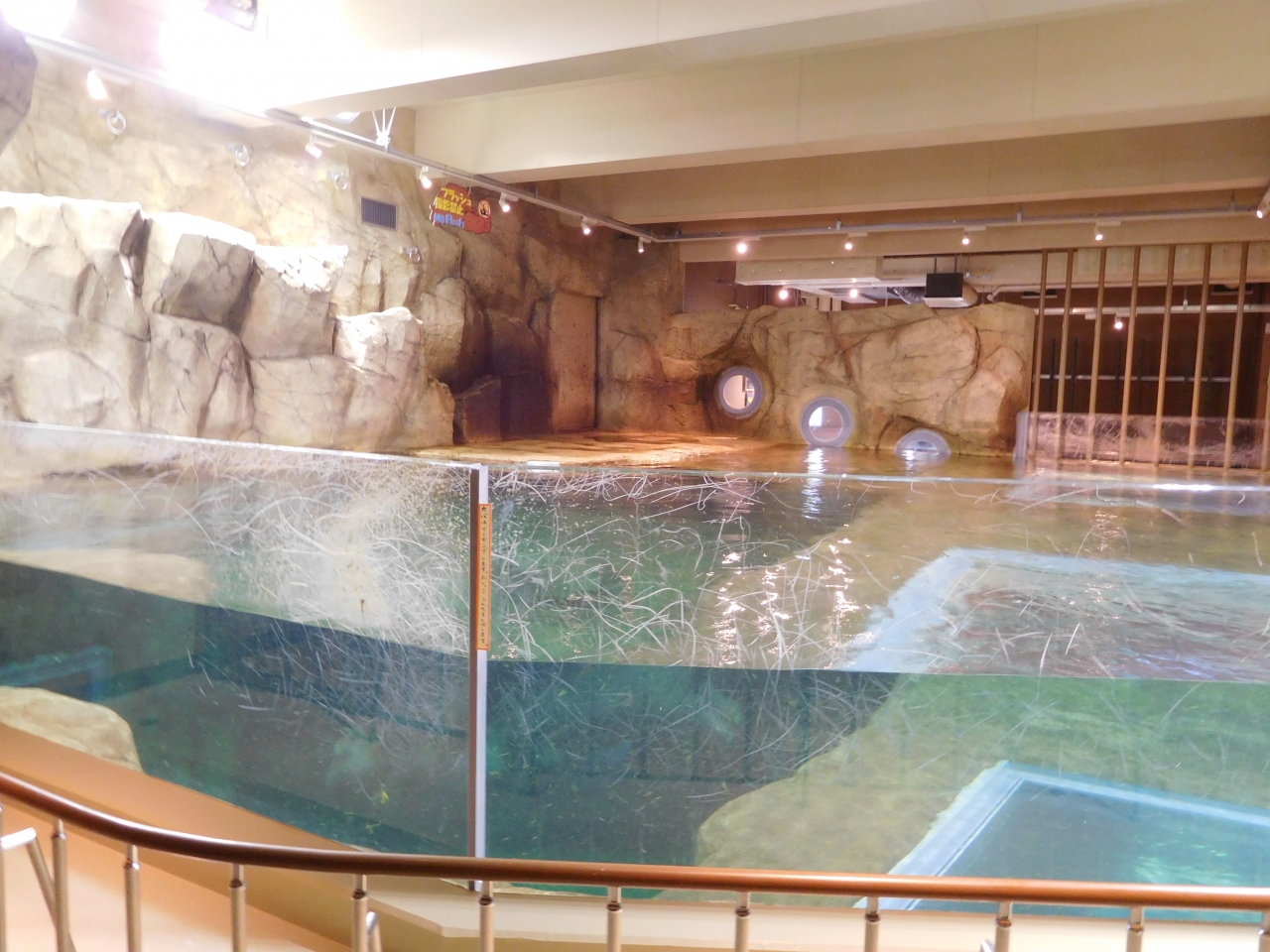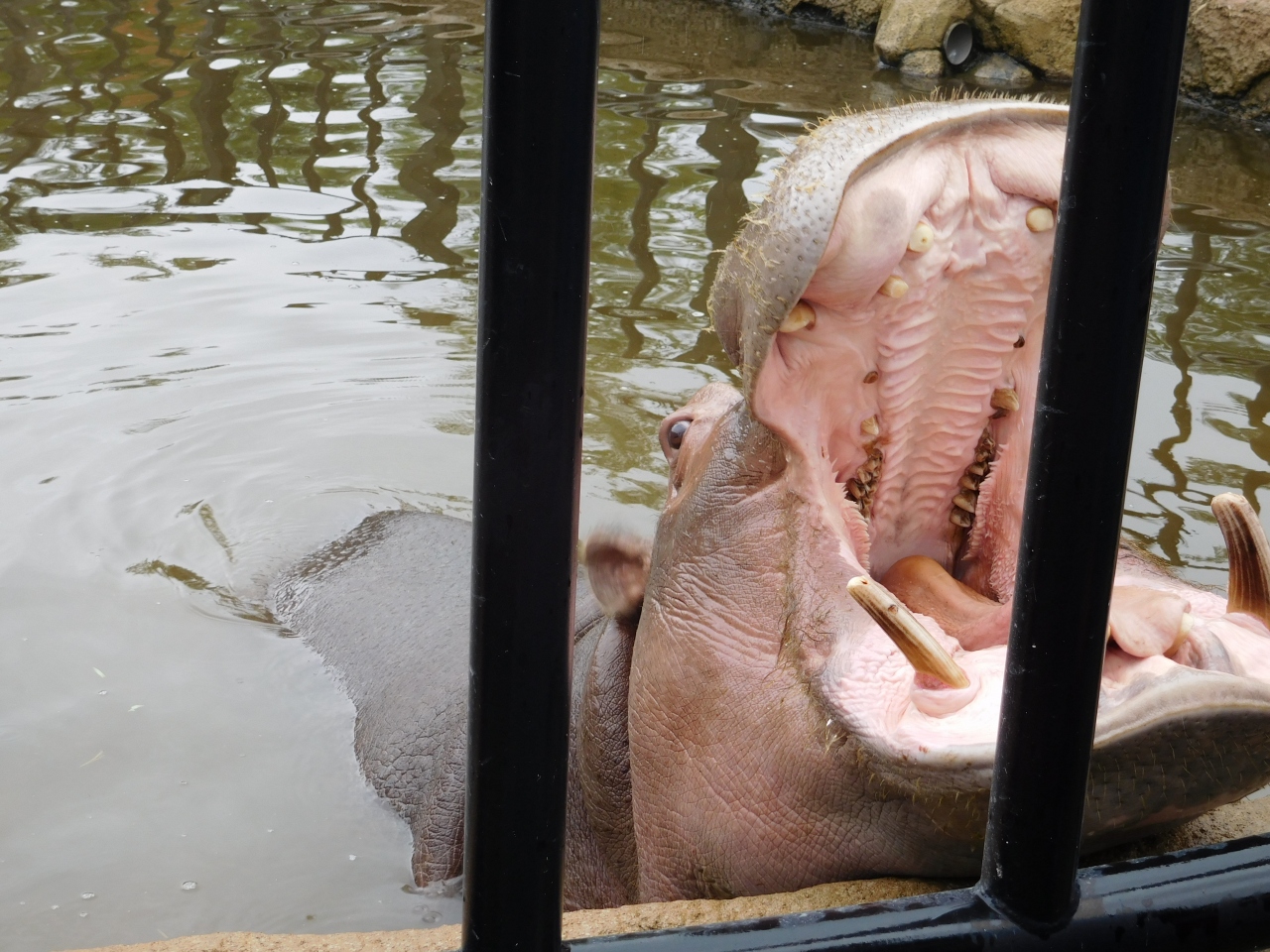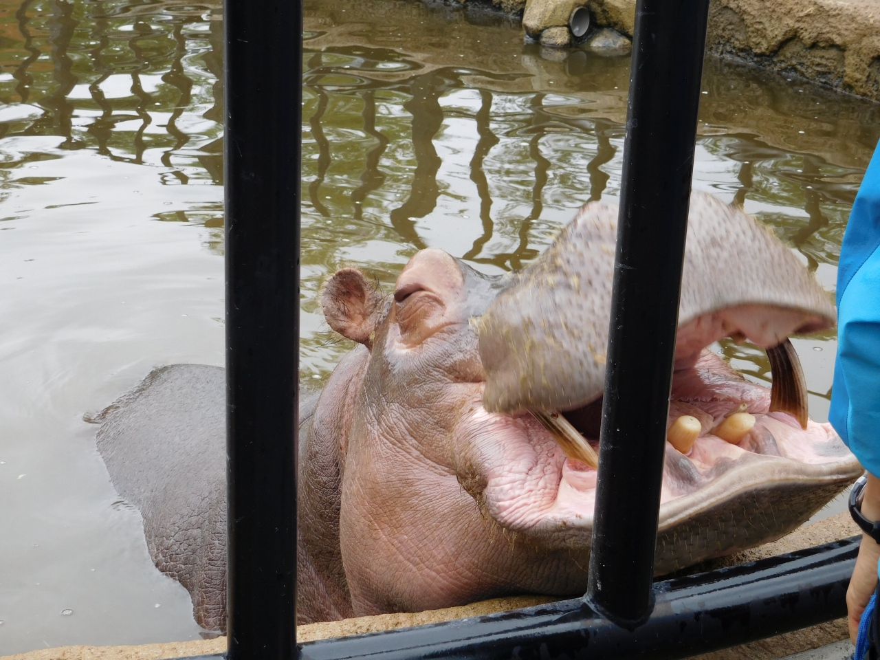 外のプールでは、オスの百吉がいました。水中でのんびりしていたり、あまり動かないな、と思っていたら、スタッフの人が「ももー」と声を掛けると、近寄って来て、口を開けたり、これまた迫力のある姿が見れました。スタッフの人とすごく信頼関係があるようで、優しそうな目をしていたのも印象的でした。2頭ともに、いろいろな姿が見れて、とても満足でした。