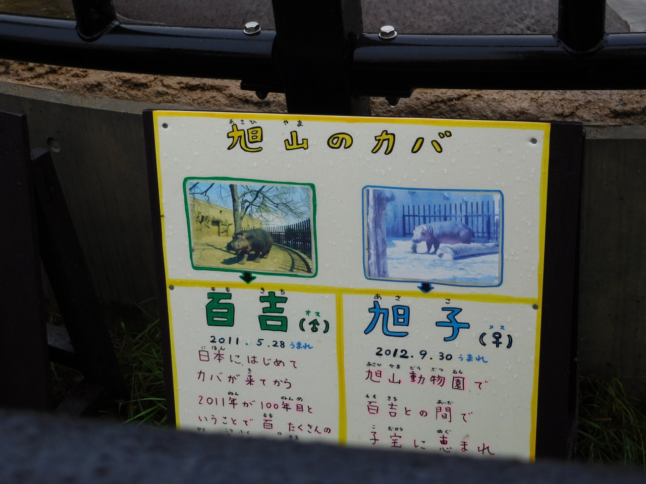 2頭のカバ(オスの百吉と、メスの旭子)が、屋内と屋外のプールに分かれていました。屋内の深さ約3メートルのプールでは、メスの旭子が、同じルートをぐるぐると、気持ち良さそうに泳いでいました。屋内のプールは、いろいろな角度からも見れるようになっていて、カバの泳ぐ迫力のある姿を沢山見る事が出来ました。(でも、ガラス面がけっこうキズだらけで、水も濁っていて、なかなかうまく写真が撮れませんでした。)