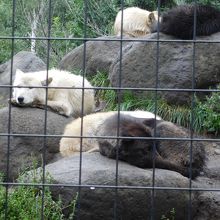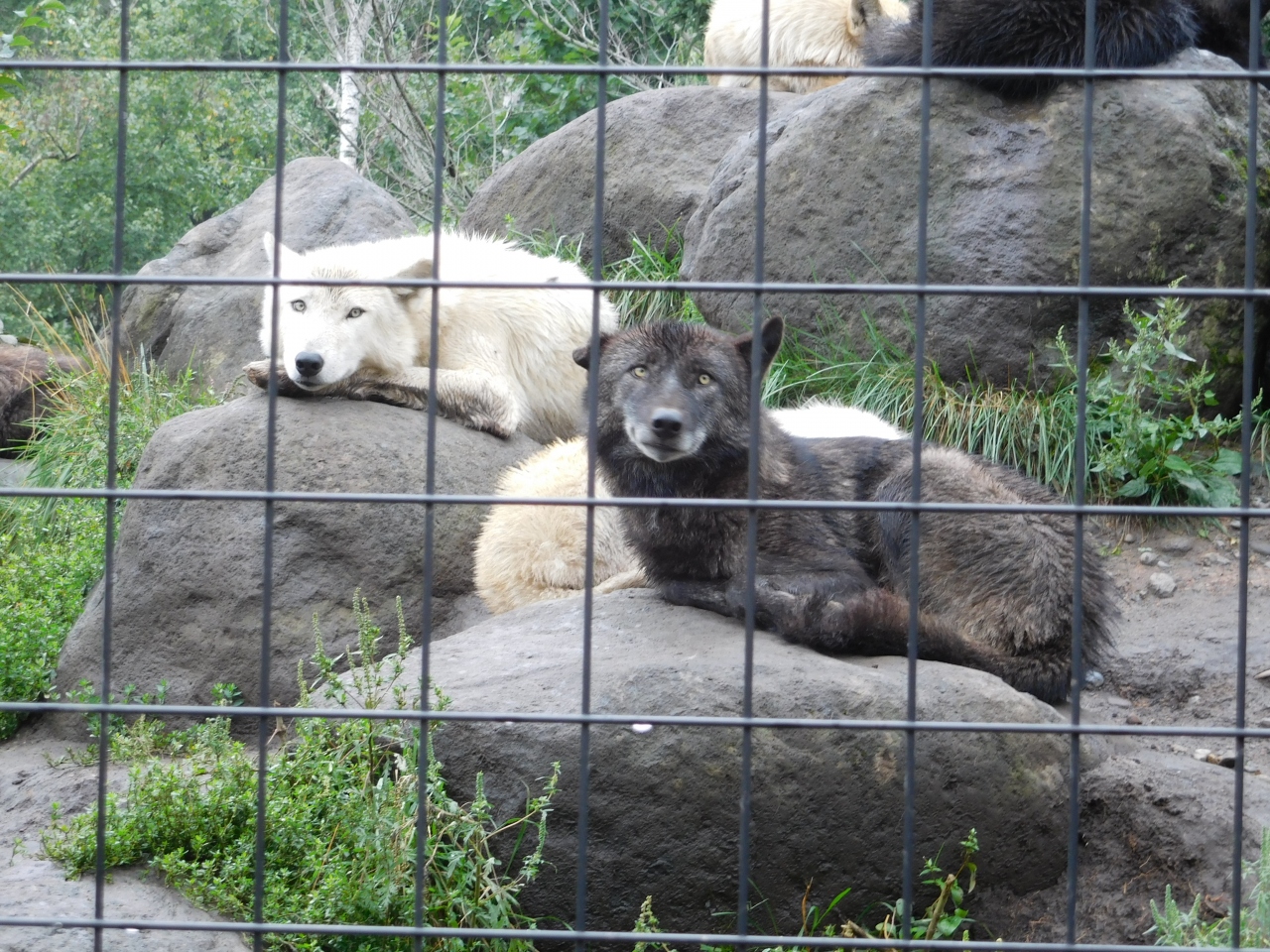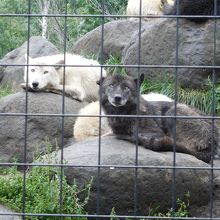 屋外の大きめの岩がゴツゴツとしている場所に、オオカミが寝ていました。最初、野生的な犬がいるな~と思って見ていたので、オオカミと気付いた時はびっくりしました。黒色のオオカミの中に、(珍しい?)白色の毛並みをしているオオカミもいました。ぐっすり寝ているのかと思いきや、周りを気にして起きたり、野生的な本能があるんだな~と思いました。