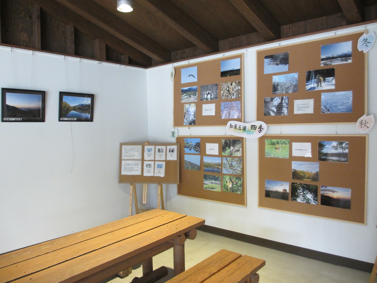 知床五湖への入口にあたるフィールドハウスの隣に建つ、土産物や軽食を売っている施設です。知床五湖内へは水とお茶以外の飲食物の持ち込みはできないため、飲食する場合はここで取るしかありません。休憩所としても使われていて、椅子の周りには知床の姿を撮った写真などが飾られています。訪れた季節以外の様子を知ることができます。